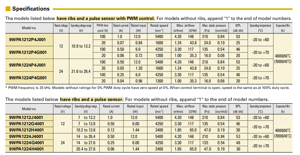 | 9WPA1224P4J001 | Splash Proof Fan | 24 | 0.5 | 12 | 5400 | 148 | 210 | 53 | 40000/60℃ (70000/40℃) | IP68 | Yes |