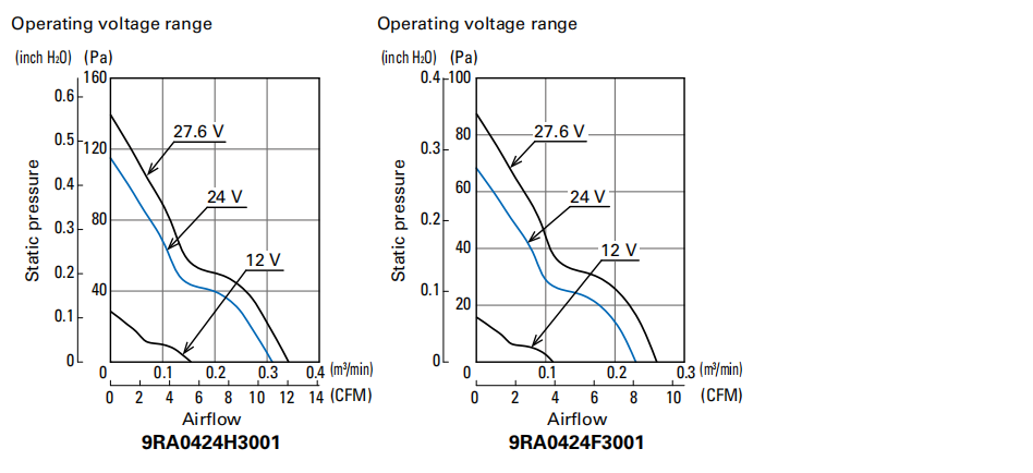 | 9RA0424H3001 | DC Fan | 40 | 28 | 24 | 0.05 | 1.2 | 9600 | 0.31 | 10.9 | 115 | 0.46 | 33 | 60000/60℃ (90000/40℃) | Pulse sensor | No | Yes |